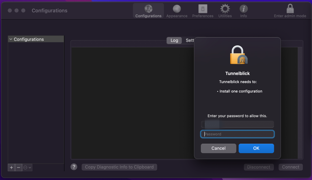다운로드한 OpenVPN 설정 파일을 Tunnelblick에 설치합니다.