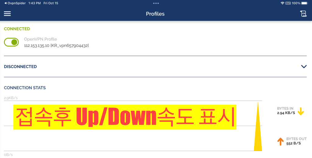 접속이 완료 후 인터넷의 Upload, Download의 속도를 표시해 줍니다.