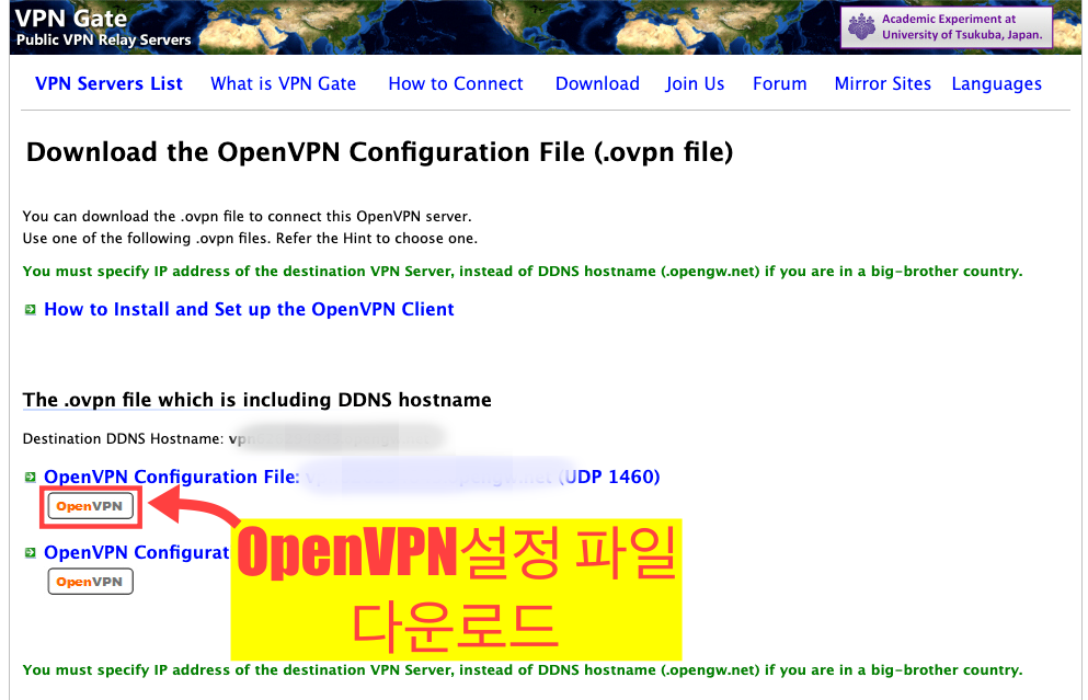 Configuration에 추가할 OpenVPN 서버 설정 파일을 vpngate.net에서 다운로드해야 합니다.