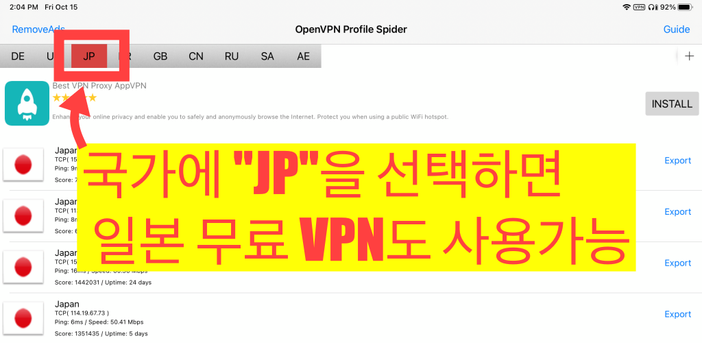 (OvpnSpider에서 Export선택 시 30초-1분 정도의 광고가 뜹니다)