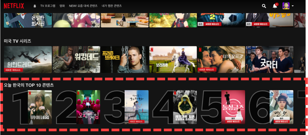한국 Netflix의 "오늘 한국의 TOP 10 콘텐츠"가 발견됩니다.