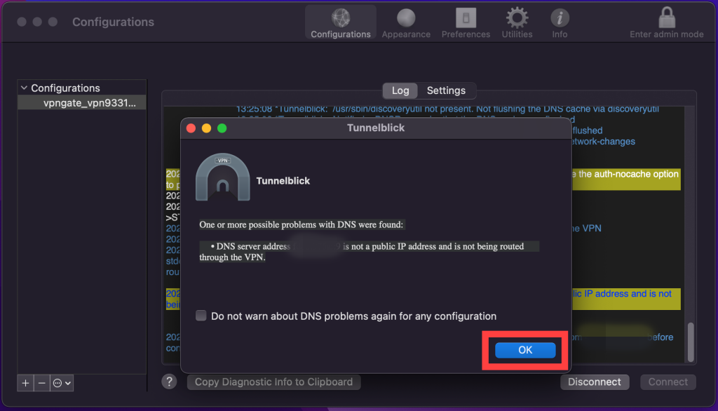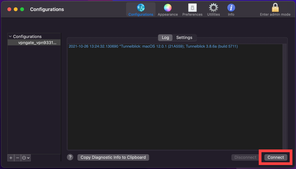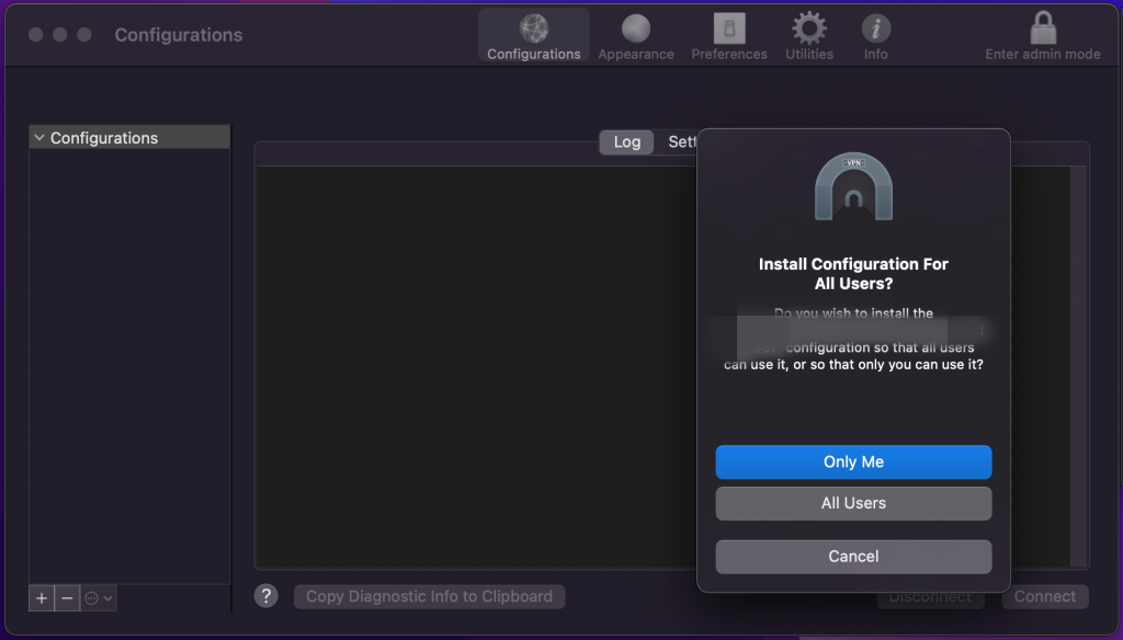 다운로드한 OpenVPN 설정 파일을 Tunnelblick에 설치합니다.