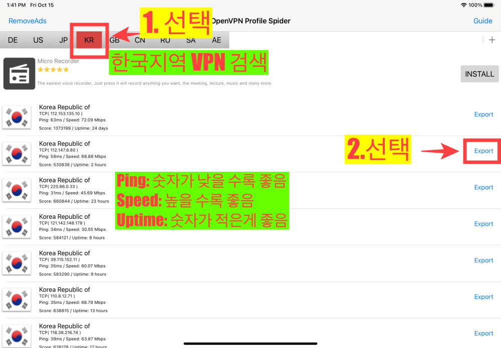(OvpnSpider에서 Export선택 시 30초-1분 정도의 광고가 뜹니다)