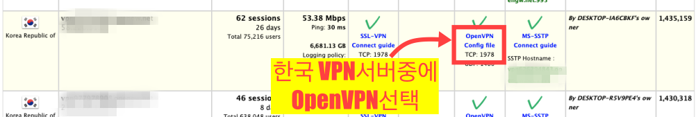 한국 서버 리스트 중에 "속도"와 "일자"를 확인해서 안정적인 OpenVPN을 찾아봅니다.