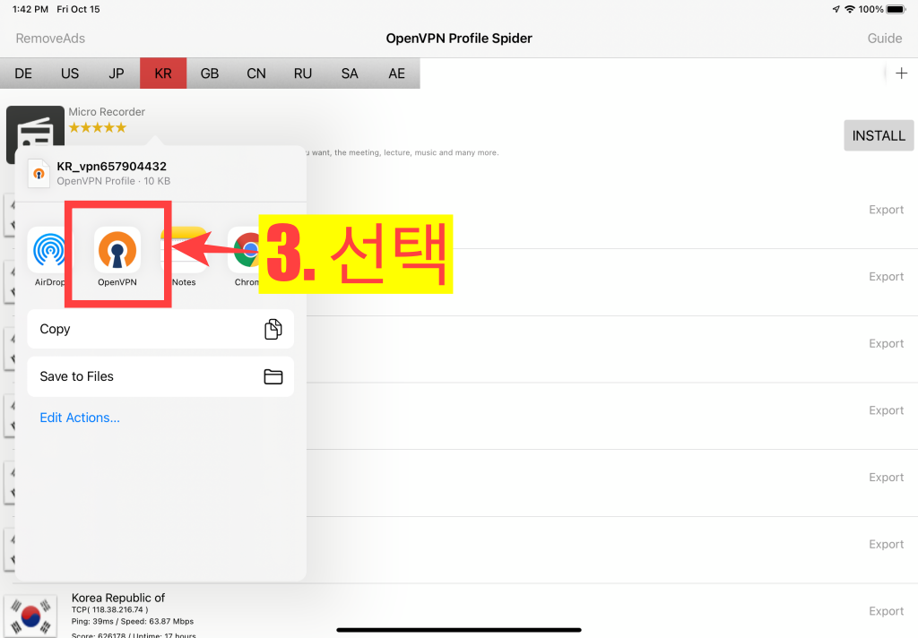 (OvpnSpider에서 Export선택 시 30초-1분 정도의 광고가 뜹니다)