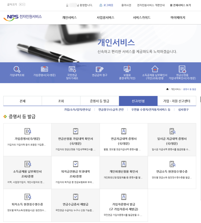 국민연금 사이트에 가면, 많은 증명 서류들을 온라인에서 프린트 할 수 있는 서비스가 되어 있습니다.