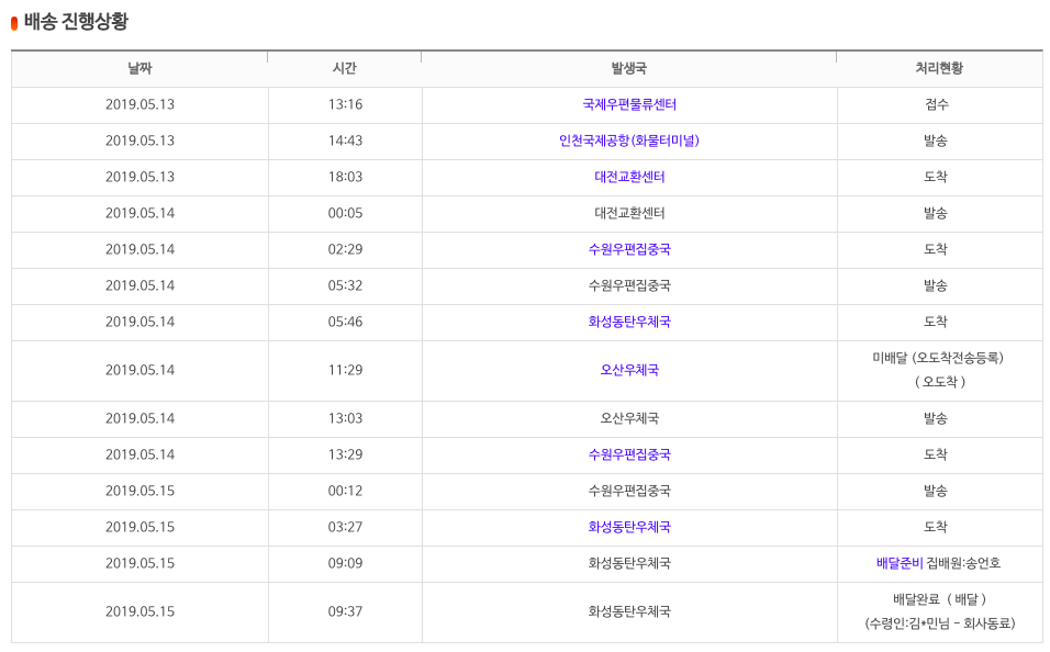 미국(PST)기준 5/14일(화) 한국우체국 이동 내용을 확인되었고, 해당 기관에 연락하니.