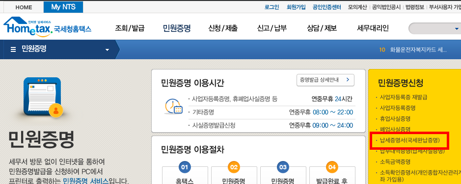 Hometax 사이트 >> 민원증명 >> 납세증명서(국세 완납증명)