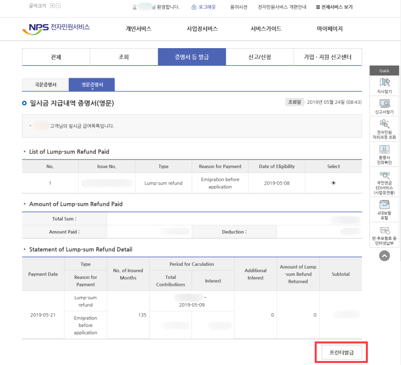 >> (옵션) 국민연금 "일시금 지급내역 증명서(영문)