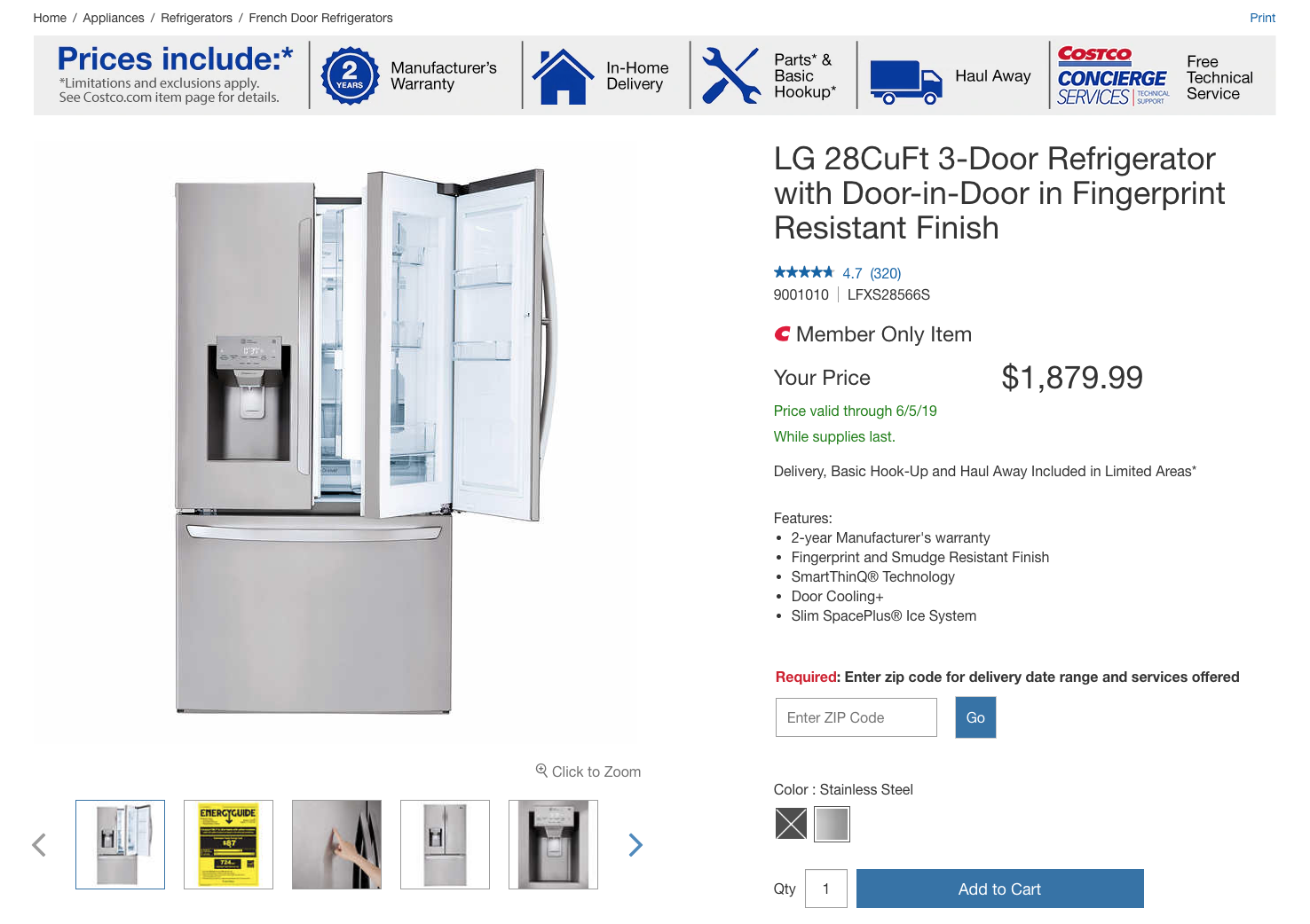 홈디포에서 제품을 보고, LG의 French Door(Model: LFXS28566S) 제품을 선택하기로 했습니다.