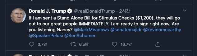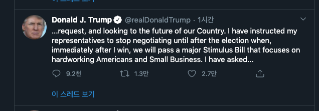 지원금에 대한 트럼프 대통령의 글을 보기 위해 트위터에 갔다가