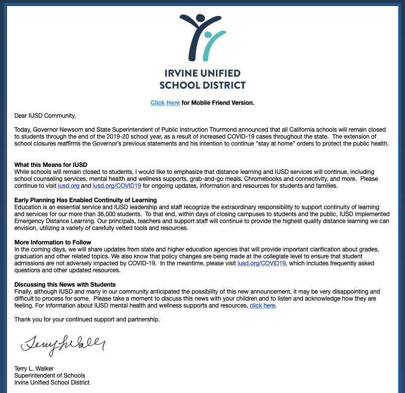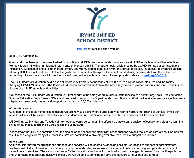 얼바인 스쿨 교육구(Irvine Unfied School District)에도 캘리포니아 주시사 Newsom의 지시대로 California의 학기말까지 휴교를 하기로 결정했다는 메일을 보내줬습니다.
