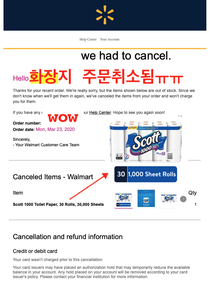 Walmart.com에 2주 전에 온라인 주문한 화장지님(?)이 Out of Stock(품절)으로 제품 구매 취소가 되었다고 이메일이 왔네요.