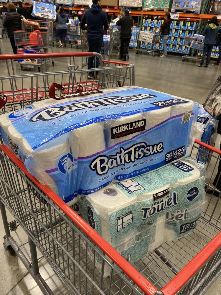 코스코(Costco)의 매장에는 물건을 사려는 사람들로 북새통을 이르고,
