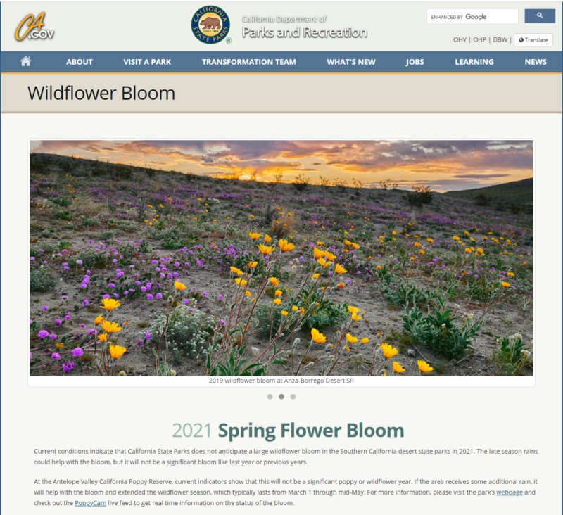 Current conditions indicate that California State Parks does not anticipate a large wildflower bloom in the Southern California desert state parks in 2021. The late season rains could help with the bloom, but it will not be a significant bloom like last year or previous years.