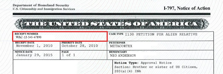 | The receipt number is a unique 13-character identifier that USCIS provides for each application or petition it receives. The agency uses it to identify and track its cases. The receipt number consists of three letters-for example, EAC, WAC, LIN, SRC, NBC, MSC or IOE-and 10 numbers. You can find it on notices of action USCIS has sent you. Omit dashes ("-") when entering a receipt number. However, you can include all other characters, including asterisks ("*"), if they are listed on your notice as part of the receipt number. |