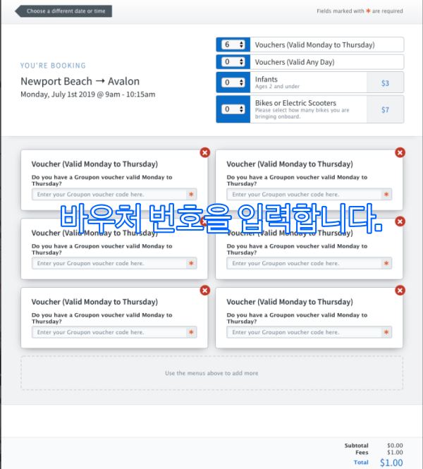 하나의 바우처로 2번(Newport Beach-> Avalon, Avalon->Newport Beach)의 예약을 해야 합니다.