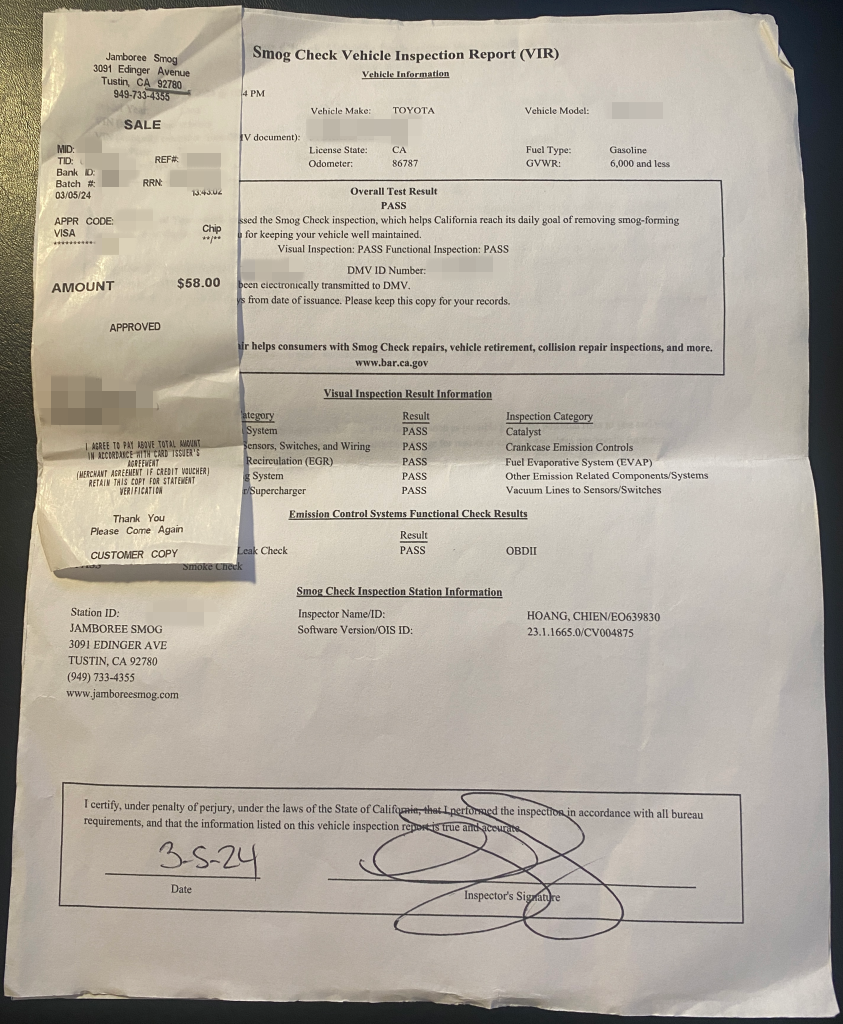 - 준비물 확인: 스모그 체크를 받기 위해서는 "Vehicle Registration Renewal Notice(차량 등록 갱신 통지서)"를 지참해야 합니다. 이 문서는 DMV에서 발송하는 차량 등록 갱신 안내서로, 검사소에서 차량 정보를 확인하는 데 필요합니다.