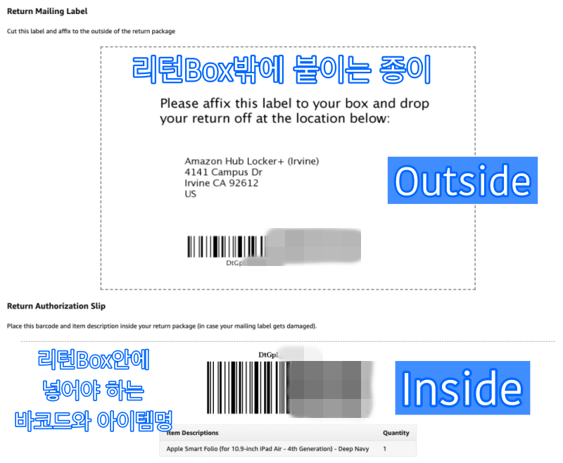 리턴 박스에 해당 라벨를 붙이고, 아래 부분의 바코드와 정보를 박스안에 넣어서