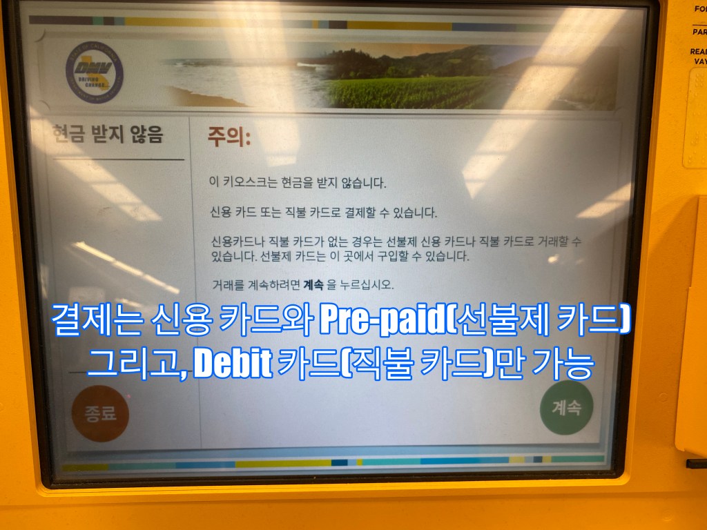 Kiosk로 납부를 원하시면, 각 지역에 가까운 Kiosk 안내가 DMV 사이트에 있습니다. (https://www.cadmvnowkiosk.com/kiosks/)