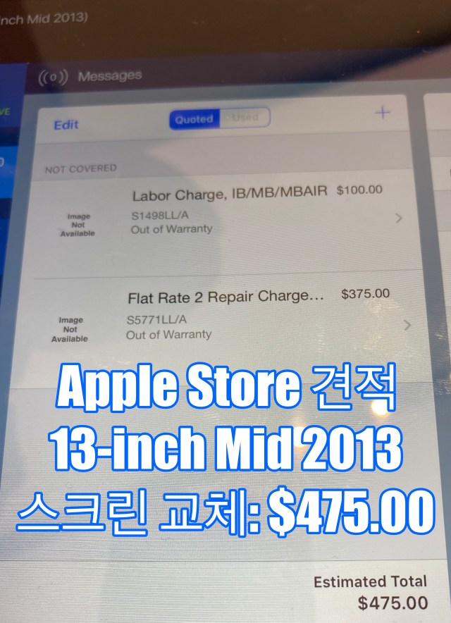 Irvine spectrum에 있는 Apple Store에 수리 예약(이틀 후에 가능했음)해서 문제점과 견적을 받았답니다.
