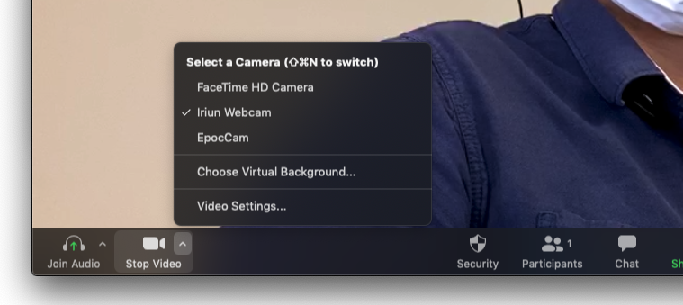 Camera 선택에서 Iriun Webcam을 선택해주시면 됩니다.