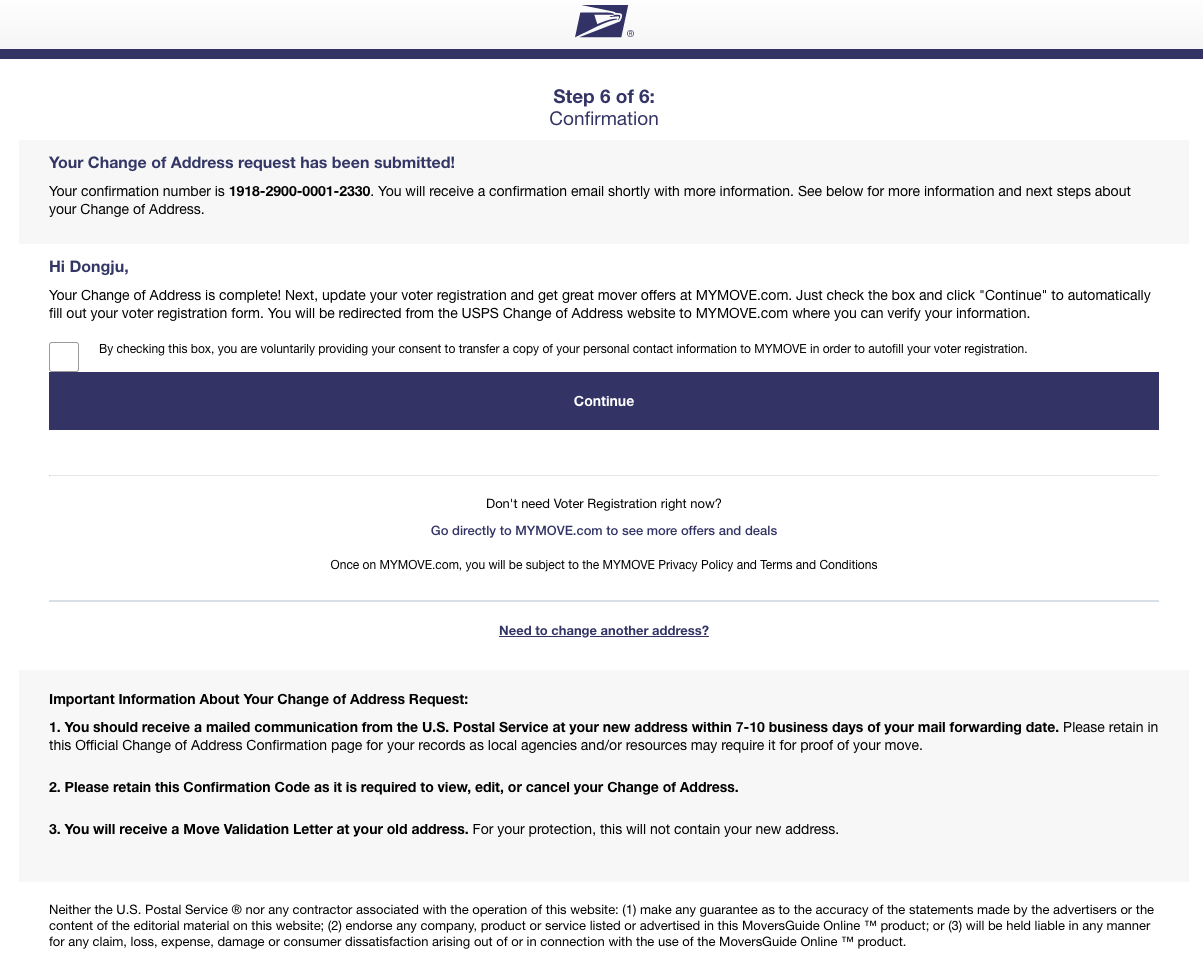 미국의 주소변경 서비스는 정말 유용합니다. 해당 서비스는 한번 신청하면 2달간 서비스를 해줍니다. (저의경우: July 1 - Aug29)