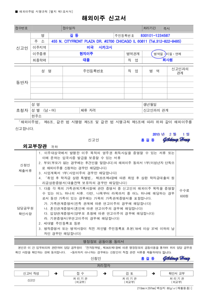 (주의) "해외 이주 신고서"를 제출하면, 가지고 계신 주민 등록증의 효력이 말소가 됩니다.