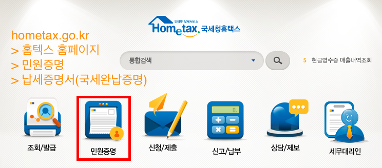 Hometax 사이트 >> 민원증명 >> 납세증명서(국세 완납증명)