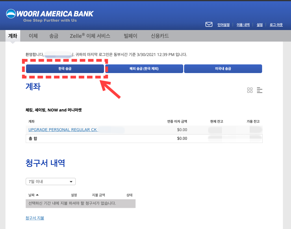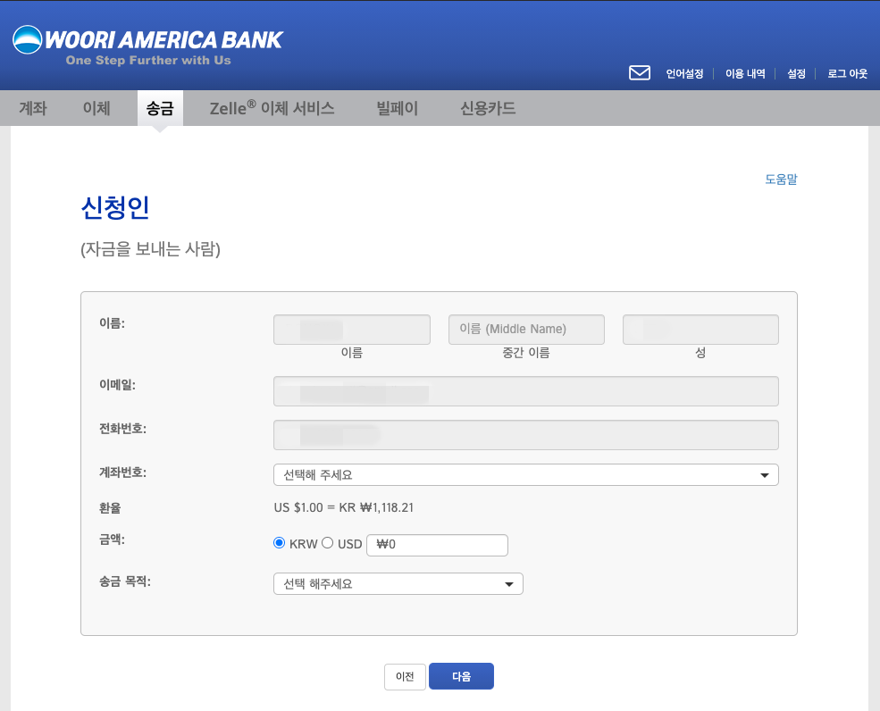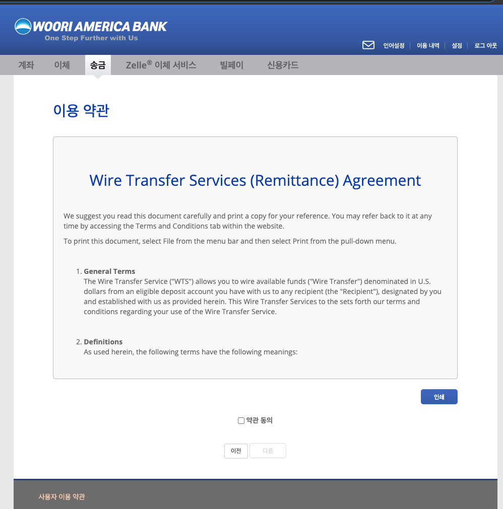 Woori America Bank을 이용해서 한국으로 이체는 안전하고 빠르기에,