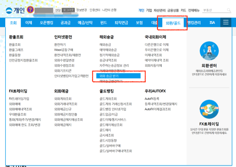 우리 은행의 "해외 송금" >"외화 송금 받기"로 USD로 이체가 되는 거죠.