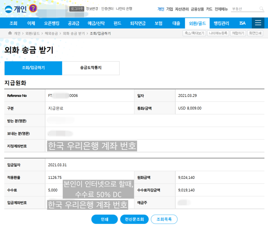 KRW(원화)로 변환된 입금 처리를 한국 우리은행 인터넷 뱅킹을 통해서 해줘야 합니다.