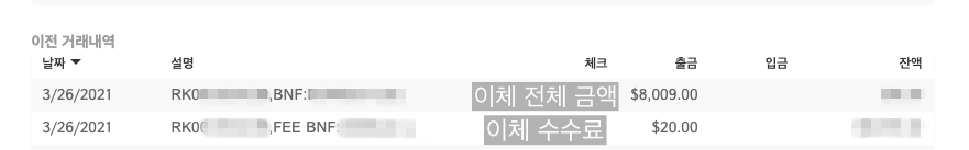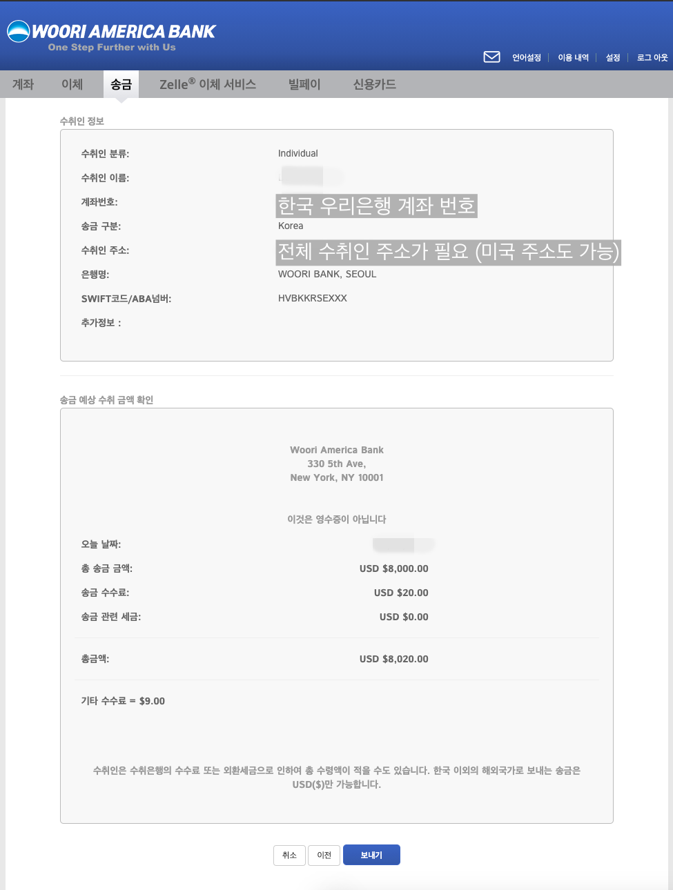 처음 해보는 미국에서 한국으로 보내는 송금(계좌 이체)이라서,