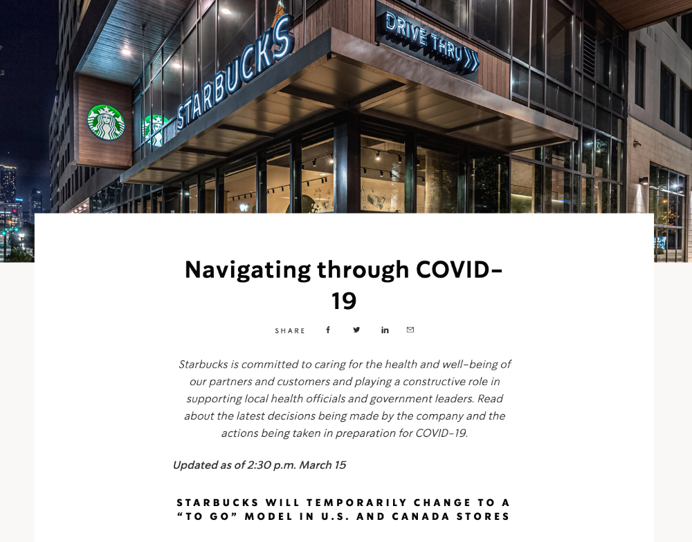 [03/15/2020 2:00 PM] U.S. 와 Canada에 있는 스타벅스 매장도 "TO GO" (On-line, Tackout, Drive Thru)만 가능해졌네요.