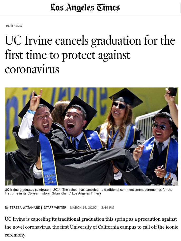(LA Times 기사: UC Irvine cancels graduation for the first time to protect against coronavirus )