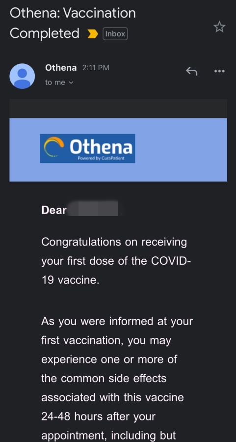 1차 접종이 마침을 알리는 접종 완료 안내 E-mail이 옵니다.