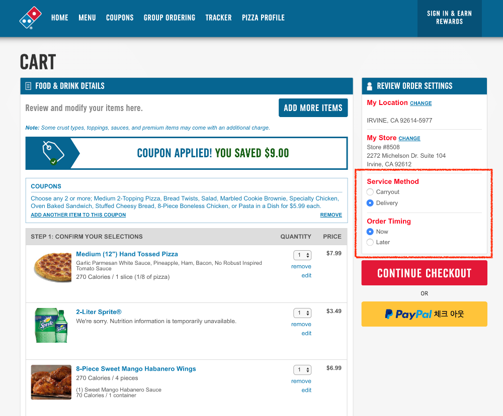 배달비가 아까울 경우, Carryout(방문 픽업)을 하셔도 되고, 주문 시간도 지금이 아닌 원하는 시간도 가능합니다.