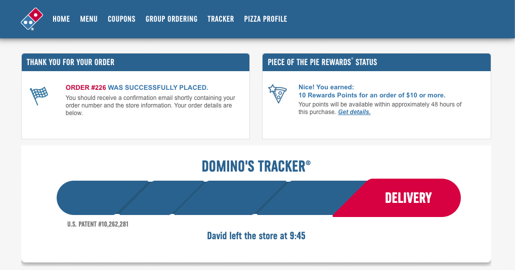 도미노 피자는 웹페이지에서 주문부터, 딜리버리까지의 상태를 보여준답니다.
